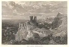 The castle was rebuilt by 1522, when the Home estates were restored to Alexander's brother George Home, 4th Lord Home. During the "Rough Wooing" of Scotland by Henry VIII, the castle was captured again by the English in 1547, but was back in Scottish hands by the time of Mary, Queen of Scots' stay here in 1566.[3] The recapture of Fast Castle from the English is said to have been instigated by Madge Gordon, a Coldingham widow.[4] Again back in the ownership of the Homes, the English ambassador Nicholas Throckmorton stayed at the castle with the 5th Lord Home on 11 July 1567, where he was "intretyed very well, according to the state of the place, which is fitter to lodge prisoners than folks at liberty, as yt is very little so yt is very stronge."[5]