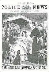 A case that led to a death and arrests was that of Sarah Jacob (May 12, 1857 – December 17, 1869), the "Welsh fasting girl", who claimed not to have eaten any food at all after the age of ten.[7] A local vicar, initially skeptical, became convinced that the case was authentic and Jacob enjoyed a long period of publicity, during which she received numerous gifts and donations from people who believed she was miraculous.