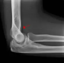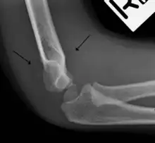 The fat pad sign, also known as the sail sign, is a potential finding on elbow radiography which suggests a fracture of one or more bones at the elbow. It is may indicate an occult fracture that is not directly visible. Its name derives from the fact that it has the shape of a spinnaker (sail).[1] It is caused by displacement of the fat pad around the elbow joint. Both anterior and posterior fat pad signs exist, and both can be found on the same X-ray.