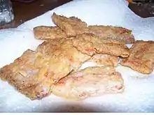 Fatback is a traditional part of southern US cuisine, soul food and the traditional cuisine of Quebec, where it is used for fried pork rinds (known there as cracklings, or oreilles de crisse in Quebec), and to flavor stewed vegetables such as leaf vegetables, green beans, and black-eyed peas. A common delicacy is strips of heavily salted and fried fatback. Fatback was extremely popular in the South during the Great Depression because it is an inexpensive piece of meat. In the southwestern United States, fried fatback is known by its Spanish name, chicharrón.