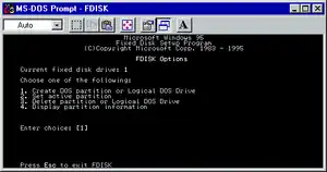 fdisk command on Microsoft Windows 95Windows 95, Windows 98, and Windows ME shipped with a derivative of the MS-DOS fdisk. Windows 2000 and its successors, however, came with the more advanced diskpart and the graphical Disk Management utilities.
