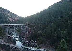 In 1957, a portion of the route between Oroville and Intake had to be relocated to make way for the Oroville Dam.[4] The new line features the North Fork Bridge,[5][6] which is 1,000 feet (300 m) long and 200 feet (61 m) high. The line began operation in 1962. During the 1970s, the Feather River Route experienced modernization, as operations became computerized.