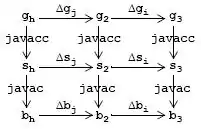 Feature-Oriented Model-Driven Design (FOMDD)[5][6] combines the ideas of AHEAD with Model-Driven Design (MDD) (a.k.a. Model-Driven Architecture (MDA)). AHEAD functions capture the lockstep update of program artifacts when a feature is added to a program. But there are other functional relationships among program artifacts that express derivations. For example, the relationship between a grammar gf and its parser source sf is defined by a compiler-compiler tool, e.g., javacc. Similarly, the relationship between Java source sf and its bytecode bf is defined by the javac compiler. A commuting diagram expresses these relationships. Objects are program representations, downward arrows are derivations, and horizontal arrows are deltas. The figure to the right shows the commuting diagram for program p3 = i+j+h = [g3,s3,b3].