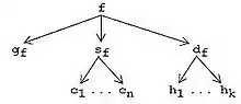Example. Suppose terminal representations are files. In AHEAD, grammar gf corresponds to a single BNF file, source sf corresponds to a tuple of Java files [c1…cn], and documentation df is a tuple of HTML files [h1…hk]. A GenVoca value (nested tuples) can be depicted as a directed graph: the graph for parser f is shown in the figure to the right. Arrows denote projections, i.e., mappings from a tuple to one of its components. AHEAD implements tuples as file directories, so f is a directory containing file gf and subdirectories sf and df. Similarly, directory sf contains files c1…cn, and directory df contains files h1…hk.