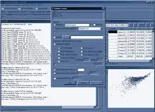 ![]() A screenshot shows the full user interface of FST1. At left is a log window with feature selection results. At center right is a result table window. At bottom right is a graphic projection of data and mixture model components. On top of it is the dialog for setting parameters of optimal subset search methods. | |
