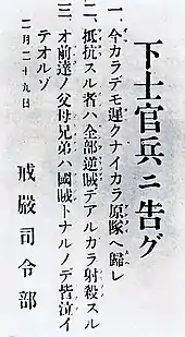 At approximately 10:00, Kurihara and Nakahashi boarded three trucks with sixty men and traveled from the Prime Minister's Residence to the offices of the Asahi Shimbun, a prominent liberal newspaper. Charging into the building, the officers forced the newspaper employees to evacuate while yelling that the attack was "divine retribution for being an un-Japanese newspaper". They then overturned and scattered the newspaper's type trays (containing 4,000 different characters) on the floor, temporarily preventing the newspaper from publishing.[66] Following the attack the men distributed copies of the uprising's manifesto to nearby newspapers and returned to the Prime Minister's Residence.[67][68]
