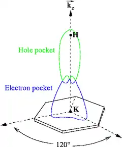 Materials with complex crystal structures can have quite intricate Fermi surfaces. Figure 2 illustrates the anisotropic Fermi surface of graphite, which has both electron and hole pockets in its Fermi surface due to multiple bands crossing the Fermi energy along the direction. Often in a metal, the Fermi surface radius is larger than the size of the first Brillouin zone which results in a portion of the Fermi surface lying in the second (or higher) zones. As with the band structure itself, the Fermi surface can be displayed in an extended-zone scheme where is allowed to have arbitrarily large values or a reduced-zone scheme where wavevectors are shown modulo (in the 1-dimensional case) where a is the lattice constant. In the three-dimensional case the reduced zone scheme means that from any wavevector there is an appropriate number of reciprocal lattice vectors subtracted that the new now is closer to the origin in -space than to any . Solids with a large density of states at the Fermi level become unstable at low temperatures and tend to form ground states where the condensation energy comes from opening a gap at the Fermi surface. Examples of such ground states are superconductors, ferromagnets, Jahn–Teller distortions and spin density waves.