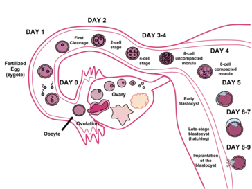 The term conception commonly refers to "the process of becoming pregnant involving fertilization or implantation or both".[31] Its use makes it a subject of semantic arguments about the beginning of pregnancy, typically in the context of the abortion debate. Upon gastrulation, which occurs around 16 days after fertilisation, the implanted blastocyst develops three germ layers, the endoderm, the ectoderm and the mesoderm, and the genetic code of the father becomes fully involved in the development of the embryo; later twinning is impossible. Additionally, interspecies hybrids survive only until gastrulation and cannot further develop. However, some human developmental biology literature refers to the conceptus and such medical literature refers to the "products of conception" as the post-implantation embryo and its surrounding membranes.[32] The term "conception" is not usually used in scientific literature because of its variable definition and connotation.