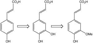 In a proposed ferulic acid biosynthetic pathway for Escherichia coli, L-tyrosine is converted to 4-coumaric acid by tyrosine ammonia lyase, which is converted to caffeic acid by Sam5, which is then converted to ferulic acid by caffeic acid methyltransferase.[18]