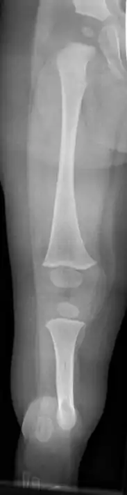 Fibular hemimelia or longitudinal fibular deficiency is "the congenital absence of the fibula and it is the most common congenital absence of long bone of the extremities."[1][2] It is the shortening of the fibula at birth, or the complete lack thereof. Fibular hemimelia often causes severe knee instability due to deficiencies of the ligaments. Severe forms of fibula hemimelia can result in a malformed ankle with limited motion and stability. Fusion or absence of two or more toes are also common.[3] In humans, the disorder can be noted by ultrasound in utero to prepare for amputation after birth or complex bone lengthening surgery. The amputation usually takes place at six months with removal of portions of the legs to prepare them for prosthetic use. The other treatments, which include repeated corrective osteotomies and leg-lengthening surgery (Ilizarov apparatus), are costly and associated with residual deformity.[4]