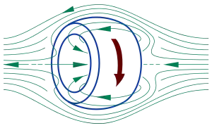 Rotating magnetic fields have also been used to drive current.[29] In such experiments, as above, gas is ionized and an axial magnetic field is produced. A rotating magnetic field is produced by external magnetic coils perpendicular to the axis of the machine, and the direction of this field is rotated about the axis. When the rotation frequency is between the ion and electron gyro-frequencies, the electrons in the plasma co-rotate with the magnetic field (are "dragged"), producing current and reversing the magnetic field. More recently, so-called odd parity rotating magnetic fields[30] have been used to preserve the closed topology of the FRC.