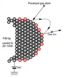 In FIM the presence of a strong field is critical. The imaging gas atoms (He, Ne) near the tip are polarized by the field and since the field is non-uniform the polarized atoms are attracted towards the tip surface. The imaging atoms then lose their kinetic energy performing a series of hops and accommodate to the tip temperature. Eventually, the imaging atoms are ionized by tunneling electrons into the surface and the resulting positive ions are accelerated along the field lines to the screen to form a highly magnified image of the sample tip.