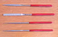 Escapement files, also known as watchmaker's files, are a classification of short, (very) thin files with bastard-cut or embedded diamond surfaces, similar to needle files in form and function but smaller. Typical dimensions are on the order of approximately 100–140 mm (4–51⁄2 in.) in length and 3–5 mm (1⁄8–3⁄16 in.) in width. Best used for fine, delicate work on small pieces or mechanisms (such as escapements), escapement files are commonly used by clock and watchmakers, as well as in crafting jewelry.
