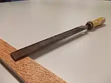 | Mill file | The most common shape, single-cut, rectangular in cross section, with an even thickness throughout their length; they may be either parallel sided or taper slightly in width from heel to end[8] | |