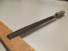 There is no unitary international standard for file nomenclature; however, there are many generally accepted names for certain kinds of files. A file is "blunt" if its sides and width are both parallel throughout its length.[2] It is "tapered" if there is a reduction in its dimensions from its heel toward its point. A file may taper in width, in thickness, or both.[2] A "tang" is a protrusion at the heel, tapered, parallel sided, or conical, for gripping, inserting in a handle, or mounting in a chuck.[2]