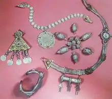 It is probable that in India, Iran (in Zanjan, this handicraft is called malileh) and various parts of central Asia filigree has been worked from the most remote period without any change in the designs. Whether the Asiatic jewellers were influenced by the Greeks who settled on that continent, or merely trained under traditions held in common with them, it is certain that the Indian filigree workers retain the same patterns as those of the ancient Greeks and work them in the same way, down to the present day. Wandering workmen are given so much gold, coined or rough, which is weighed, heated in a pan of charcoal, beaten into wire, and then worked in the courtyard or verandah of the employer's house according to the designs of the artist, who weighs the complete work on restoring it and is paid at a specified rate for his labour. Very fine grains or beads and spines of gold, scarcely thicker than coarse hair, projecting from plates of gold are methods of ornamentation still used.[3]