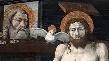 It is argued that in the relations between the persons of the Trinity, one person cannot "take" or "receive" (λήμψεται) anything from either of the others except by way of procession.[10] Biblical texts such as John 20:22,[11] were seen by Fathers of the Church, especially Athanasius of Alexandria, Cyril of Alexandria and Epiphanius of Salamis as grounds for saying that the Spirit "proceeds substantially from both" the Father and the Son.[12] Other texts that have been used include Galatians 4:6,[13] Romans 8:9,[14] Philippians 1:19,[15] where the Holy Spirit is called "the Spirit of the Son", "the Spirit of Christ", "the Spirit of Jesus Christ", and texts in the Gospel of John on the sending of the Holy Spirit by Jesus,[16] and John 16:7.[17][10] Revelation 22:1[18] states that the river of the Water of Life in Heaven is "flowing from the throne of God and of the Lamb", which may be interpreted as the Holy Spirit proceeding from both the Father and the Son. Tension can be seen in comparing these two passages: