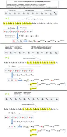A bank of receivers can be created by performing a sequence of FFTs on overlapping segments of the input data stream. A weighting function (aka window function) is applied to each segment to control the shape of the frequency responses of the filters. The wider the shape, the more often the FFTs have to be done to satisfy the Nyquist sampling criteria.[upper-alpha 1] For a fixed segment length, the amount of overlap determines how often the FFTs are done (and vice versa). Also, the wider the shape of the filters, the fewer filters that are needed to span the input bandwidth. Eliminating unnecessary filters (i.e. decimation in frequency) is efficiently done by treating each weighted segment as a sequence of smaller blocks, and the FFT is performed on only the sum of the blocks. This has been referred to as weight overlap-add (WOLA) and weighted pre-sum FFT. (see § Sampling the DTFT)