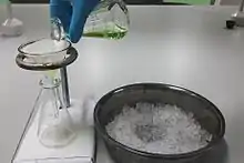 Hot filtration method is mainly used to separate solids from a hot solution. This is done to prevent crystal formation in the filter funnel and other apparatus that come in contact with the solution. As a result, the apparatus and the solution used are heated to prevent the rapid decrease in temperature which in turn, would lead to the crystallization of the solids in the funnel and hinder the filtration process.[3] One of the most important measures to prevent the formation of crystals in the funnel and to undergo effective hot filtration is the use stemless filter funnel. Due to the absence of a stem in the filter funnel, there is a decrease in the surface area of contact between the solution and the stem of the filter funnel, hence preventing re-crystallization of solid in the funnel, adversely affecting the filtration process.
