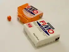 Fimo is a brand of polymer clay made by German company Staedtler (STAEDTLER Mars GmbH & Co. KG). Fimo is sold worldwide. Its main U.S. competitor is the American brand Sculpey. The material comes in many different colors; there are many finishes to choose from, and even a softener to use with it because it can be hard to work.[1] It is used for making many objects, including jewelry, accessories, and small ornaments. Once shaped, Fimo is baked in a standard or toaster oven for about 30 minutes at 130 °C (265 °F) to harden it. Once baked, it can be cut, drilled, painted, sanded, and sliced thinly. According to information from Staedtler, Fimo contains polyvinyl chloride (PVC), but has not contained any phthalates since 2006.[2]