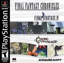 Final Fantasy Chronicles is a compilation of Square's role-playing video games Final Fantasy IV and Chrono Trigger, released for the North American Sony PlayStation on July 2, 2001.[2] TOSE ported both titles from the Super Nintendo Entertainment System; each had been previously released as individual Japanese PlayStation ports in 1997 (Final Fantasy IV) and 1999 (Chrono Trigger).[3][4] Several bonus features were added to each game, such as art galleries, bestiaries, and cutscenes—including computer-generated full motion video used at the beginning of Final Fantasy IV and anime scenes used throughout Chrono Trigger.[5]