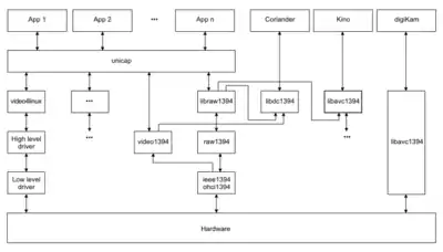 - Video cameras are accessed by various APIs. The image to the right depicts the access of the video editing software Kino to the libavc1394 API. Kino also accesses other APIs which are not shown in the image to simplify matters.