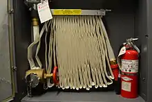A fire hose (or firehose) is a high-pressure hose that carries water or other fire retardant (such as foam) to a fire to extinguish it. Outdoors, it attaches either to a fire engine, fire hydrant, or a portable fire pump. [1] Indoors, it can permanently attach to a building's standpipe or plumbing system.