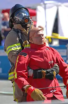 The fifth and final event is the victim rescue. This event simulates a firefighter removing a victim from a fire as quickly as possible to save the victim from injury. A 175 lb. mannequin must be picked up from the ground, grabbed from behind, and dragged backwards 100 ft.[4] The competitor must drag it backwards at all points of time. The competitor must grab the mannequin from behind with their arms beneath the mannequins arms and around the mannequin's chest. Time ends once the 175 pound mannequin and the competitor passes the 100 ft line.[5] Then competition has ended the Challenge course, and time is stopped.