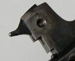 A striker mechanism will consist of the striker spring (firing spring) and the striker. The striker spring is a relatively strong spring sufficient to initiate firing. A typical striker consists of a narrow striking point, a heavier section that acts as a spring guide for the striker spring, a shoulder to restrain the spring, and a catch piece which is engaged by the trigger sear to hold the spring under tension when "cocked" and ready to fire. The striker spring is compressed between the striker's shoulder and the rear of the breechblock. A striker may be assembled from several component; however, the stored energy in the striker spring is transferred directly to the striker and then to the primer without any intermediate transfer of energy or momentum. As striker mechanisms combine both functions of hammer and firing pin in one piece, they are generally considered to be mechanically simpler but are more robust in construction than a typical firing pin.[12]