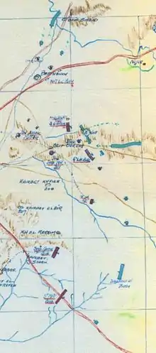 On 28 February, Chetwode's Desert Column occupied Khan Yunis unopposed and the headquarters of the Column was established at Sheikh Zowaiid, while Eastern Force headquarters remained at El Arish.[6] The ancient town of Khan Yunis on the main road to Gaza was said to be the birthplace of Delilah. With bazaars, narrow streets and a castle, it was one of several villages in this fertile area of southern Palestine, 6 miles (9.7 km) north of Rafa and the Egyptian–Ottoman frontier. Here was found the largest and deepest well in the area, and after engineers had installed a pumping machine, it gave an unlimited supply of water for both men and horses. The village quickly became an important forward site for supply depots and bivouacs.[8][25] Around Khan Yunis gardens, orange orchards, fig plantations and grazing were carried on by the local population, while in the Rafa and Sheikh Zowaiid areas barley and wheat were grown.[8][9][10]