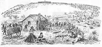 From August to October 1860, there were numerous skirmishes close to New Plymouth, including one on 20 August involving an estimated 200 Māori, just 800 metres from the barracks on Marsland Hill. Many settlers' farms were burned and the village of Henui, 1.6 km from town, was also destroyed. Several farmers and settlers, including children, were killed by hostile Māori as they ventured beyond the town's entrenchments, including John Hurford (tomahawked at Mahoetahi on 3 August), Joseph Sarten (shot and tomahawked, Henui, 4 December), Captain William Cutfield King (shot, Woodleigh estate, 8 February 1861) and Edward Messenger (shot, Brooklands, 3 March).[26] There were frequent skirmishes around Omata and Waireka, where extensive trenches and rifle pits were dug on the Waireka hills to threaten a British redoubt on the site of the Kaipopo pā.[22]