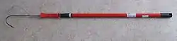 In fishing, a gaff is a handheld pole with a sharp hook or sideway spike on the distal end, which is used to swing and stab into the body of a large fish like a pickaxe, and then pull the fish out of the water like using a pike pole. Ideally, the tip of the hook/spike is placed under the fish's backbone.