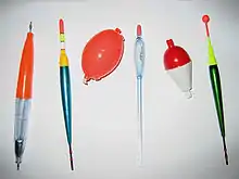 A sinker or plummet is a weight used when angling to force the lure or bait to sink more rapidly or to increase the distance that it may be cast. The ordinary plain sinker is traditionally made of lead. It can be practically any shape, and is often shaped round like a pipe-stem, with a swelling in the middle. However, the use of smaller lead based fishing sinkers has now been banned in the UK, Canada and some states in the US,[4] since lead can cause toxic lead poisoning if ingested. There are loops of brass wire on either end of the sinker to attach the line. Weights can range from a quarter of an ounce for trout fishing up to a couple of pounds or more for sea bass and menhaden.