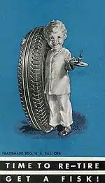 The company was known for its "Time to Re-Tire" tagline, featuring a young, pajama-clad boy with his right arm encircling a tire and his left hand holding a candle. The boy was designed in 1910[4] by Burr Giffen (1886–1965), an agency art director who was still awake at an early hour. The next day, he presented his sketch to his manager, who liked it so much that it was made into a poster for the Fisk Company. The character was redesigned in 1930 by Paul Martin. The original painting was sent to the Metropolitan Museum of Art for restoration after the US Rubber Company acquired Fisk.[5]