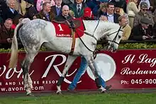 Fiveforthree is a grey horse bred at the Rusellstown stud near Mullingar in County Westmeath by Peter and Ann Downes. He was sired by Arzanni (1987–2002) who won the Yorkshire Cup and took second place in Ascot Gold Cup for his owner and breeder the Aga Khan in 1991. Apart from Fiveforthree, his best runner was probably Eskleybrook, a successful steeplechaser.[2] Fiveforthree's dam What A Queen had previously produced Celestial Gold, a very successful chaser who won the Paddy Power Gold Cup and the Hennessy Gold Cup in 2004.[3] What A Queen was a descendant of Lady Sunderlin, a half-sister of the Grand National winner Mr What.