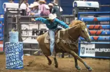 Flag Racing is a rodeo and O-Mok-See event in which a horse and rider attempt to complete a pattern around preset barrels in the fastest time. The contest must deposit a flag in one bucket and remove a flag from another bucket.[1] It is a youth rodeo event for both boys and girls.