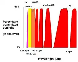 The sun emits an enormous amount of energy, which would be harmful to human beings if not for the vapours and gases in the atmosphere, like water (clouds), ozone, and others, through which the sunlight is filtered. In the figure it can clearly be seen that "cold" CO2 filters the solar radiation around 4.3 μm. An Infrared detector which uses this frequency is therefore solar blind. Not all manufacturers of flame detectors use sharp filters for the 4.3 μm radiation and thus still pick up quite an amount of sunlight. These cheap flame detectors are hardly usable for outdoor applications. Between 0.7 μm and approx. 3 μm there is relatively large absorption of sunlight. Hence, this frequency range is used for flame detection by a few flame detector manufacturers (in combination with other sensors like ultraviolet, visible light, or near infrared). The big economical advantage is that detector windows can be made of quartz instead of expensive sapphire. These electro-optical sensor combinations also enable the detection of non-hydrocarbons like hydrogen fires without the risk of false alarms caused by artificial light or electrical welding.
