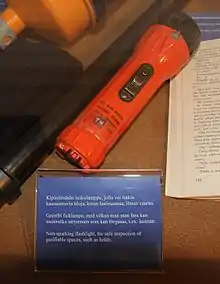 Flashlights intended for use in hazardous areas with flammable gas or dust are tested to ensure they cannot set off an explosion.[21] Flashlights approved for flammable gas areas have markings indicating the approving agency (MSHA, ATEX, UL, etc.) and symbols for the conditions that were tested. Flashlights for hazardous areas may be designed to automatically disconnect the lamp if the bulb is broken, to prevent ignition of flammable gas.[22]