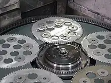 The removal of the material is done by using geometrically undefined cutting edges (grain bound) that are held together in large working wheels with a thin layer of abrasive. The workpieces are held in toothed carriers (plastic, steel) that are driven by two horizontal pin rings. The full workpiece surface is in constant contact with an abrasive wheel.[3]
