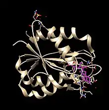 Flavodoxins (Fld) are small, soluble electron-transfer proteins.[1][2] Flavodoxins contains flavin mononucleotide as prosthetic group. The structure of flavodoxin is characterized by a five-stranded parallel beta sheet, surrounded by five alpha helices.[3] They have been isolated from prokaryotes, cyanobacteria, and some eukaryotic algae.[2]