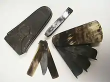 Early craftsmen often varied the number of blades, the types of materials used for the bolsters, and the types of instruments included in the bolster for patient care. Pictured to the right is a three-blade fleam with a horn handle made in Scotland by the Sanderson craftsmen. This piece has a thumb lancet in one shield of the bolster and a thumb forceps in the other.
