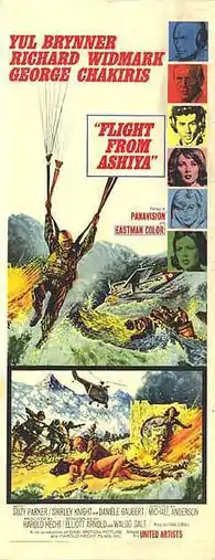 Flight from Ashiya (aka Ashiya Kara no hiko) is a 1964 film about the U.S. Air Force's Air Rescue Service, flying from Ashiya Air Base, Japan. In this fictionalized American-Japanese co-production film set in the early 1960s, a flight crew's mission is to rescue a liferaft of Japanese civilians stranded in rough seas.[3] The film was based on the 1956 novel Rescue! by Elliott Arnold (repressed as Flight from Ashiya in 1959). It was released in Japan as Ashiya Kara no hiko.[4]