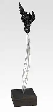 From 2003 to 2009, Froehlich worked intensely on the "Saignelégier Steles" for the catholic church in Saignelégier, Jura Switzerland, project which received national funding from the Swiss Confederation,[8] and which was executed in collaboration with the glass master-craftsman Roland Béguin[9]), and the metalwork artist J.-P. Scheuner using experimental techniques.[8] The novel concept of the stele allows keeping all the church's luminosity by occupying only a very limited space.[8] In contrast to normal stained glass which is not lit, Froehlich is using in Saignelégier artificial light: indeed, three steles, called the Golgotha group, are strongly backlit.[8] Every of the 21 four-meter high steles is associated with a text from the bible[8] commented by Father Bernard Miserez.[10] The dalle glass was produced specifically for this project, in Waldsassen (Germany).[8] The Saignelégier Steles are a novel contribution to contemporary sacred glasswork.[11][12]