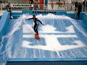 Although the first artificial waves in a pool were developed back in the 19th century by King Ludwig of Bavaria, they required a completely different technology from that of flow riding.[4] The activity of flow riding is closely associated with “FlowRider”, a technology created by Tom Lochtefeld, founder of Wave Loch that shoots more than 230,000 L (60,000 US gal) of water per second, with a speed of 32 km/h to 48 km/h on a padded, inclined surface.[5] At full capacity, 380,000 L (100,000 US gal) of water per minute can amount to waves as high as 1.8 m (6 ft).[6] With this technology, flow riders, those who lie, kneel or stand on a board, attempt to balance on these artificial waves, called sheet waves, and more professional riders seek to perform tricks.[7]