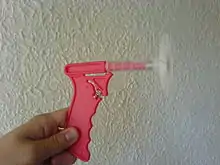The fly gun (or flygun), a derivative of the flyswatter, uses a spring-loaded plastic projectile to mechanically "swat" flies. Mounted on the projectile is a perforated circular disk, which, according to advertising copy, "won't splat the fly". Several similar products are sold, mostly as toys or novelty items, although some maintain their use as traditional fly swatters.