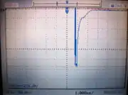 (left) Oscilloscope trace showing inductive voltage spike in solenoid connected to a 24 VDC power supply. (right) The same switching transient with a flyback diode (1N4007) connected across the solenoid. Note the different scaling (50 V / division on the left, 1 V / division on the right).