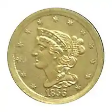 Copper prices resurged in late 1852 and into 1853 past the $0.40 per pound that the Mint viewed as the break-even point for cent manufacture after considering the cost of production; 1 pound (0.45 kg) of copper made 42⅔ large cents. In 1853, patterns using a base-metal alloy were struck using a quarter eagle obverse die, about the size of a dime.[7] Some of the proposed alloys contained the metal nickel.[5] Also considered for use in the cent was "French bronze" (95% copper with the remainder tin and zinc)[lower-alpha 1] and various varieties of German silver. In his 1854 annual report, Mint Director James Ross Snowden advocated the issue of small, bronze cents, as well as the elimination of the half cent, which he described as useless in commerce.[8] A number of pattern cents were struck in 1854 and 1855. These featured various designs, including several depictions of Liberty and two adaptations of work by the late Mint chief engraver Christian Gobrecht: one showing a seated Liberty, which Gobrecht had placed on the silver coins in the 1830s, and another of a flying eagle, which Gobrecht had created based upon a sketch by Titian Peale.[9]