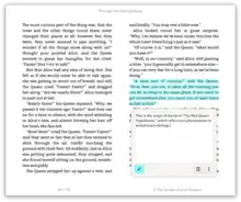 Its customizable and theme-based user interface is inspired by those of portable e-reader hardware devices. It follows the GNOME standards and automatically adapts to different screen formats.[3] It is streamlined for distraction-free reading and is described as pleasant and more polished than other free desktop applications. Books are displayed in a paginated view, with double-page or single-page view depending on screen size, or in a continuous scrolling view, with customizable typeface, spacing/margins, brightness and size/zoom. Control elements hide with an automatic fading effect while basic navigation with hidden controls is still possible by clicking/tapping on pages or arrow keys.[4] It has a toggleable navigation sidebar, can display a reading time estimate with a progress slider with chapter markers and supports multi-touch gestures such as pinch zoom. A full-screen mode and an optional traditional title bar can be activated.[4] In skeuomorphic mode, Foliate mimicks the look of a traditional paper book.