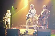 A more recent and minor trend is "fop rock", a form of camp in which the performers don 18th-century wigs, lace cravats, and similar costume elements to perform. The style appears to owe something to glam rock, visual kei, and the New Romantic movement. The look was pioneered in the 1960s by Paul Revere & the Raiders. Adam Ant of Adam and the Ants picked up the trend, occasionally performing in elaborate highwayman outfits. Other notable examples would be Falco's performance as Wolfgang Amadeus Mozart in the song "Rock Me Amadeus" (a No. 1 hit in the US, the UK and Canada in 1986), Japanese rock group Malice Mizer, and Boston-based band the Upper Crust.[6][7] Mid-2000s glam rock revivalists White Hot Odyssey also affected 18th century-style wigs and clothing for their live performances. Prince was known for his foppish clothing in the mid-1980s, with ruffled shirts, tight pants and high-heeled boots.[8]