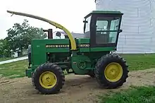 Forage harvesters can be implements attached to a tractor,[4] or they can be self-propelled units. In either configuration, they comprise a drum (cutterhead) or a flywheel[5] with a number of knives fixed to it that chops and blows the silage out of a chute of the harvester into a wagon that is either connected to the harvester or to another vehicle driving alongside. Towed harvesters are either single-chop, double-chop or precision-chop. Most larger machines also have paddle accelerators to increase material speed and improve unloading characteristics.